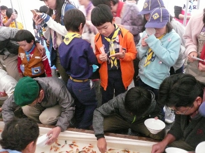 記念式典の後は、2500匹の金魚すくい団対抗戦。